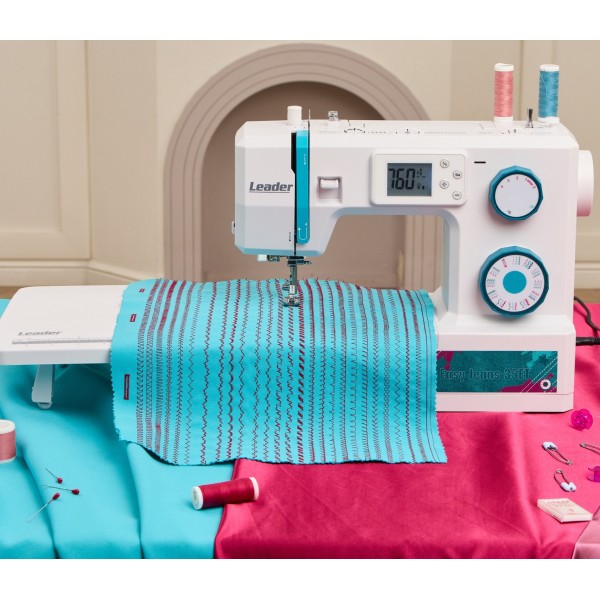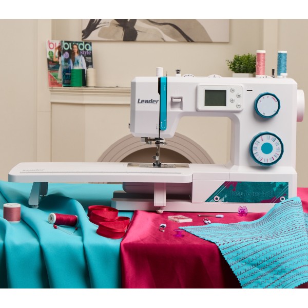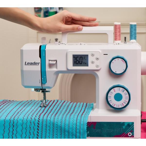 В машине предусмотрено 34 швейные операции, включая рабочие, трикотажные, потайные, оверлочные, декоративные строчки, строчки для квилтинга и автоматическую петлю для пуговицы.Leader Easy Jeans 35ET имеет горизонтальный челнок, что обеспечивает быструю и удобную заправку шпульки, а также позволяет видеть наличие нижней нити. На игольной пластине предусмотрена линейная разметка, используемая в технике квилтинг. 7-сегментная зубчатая рейка надёжно продвигает ткани и текстуры.