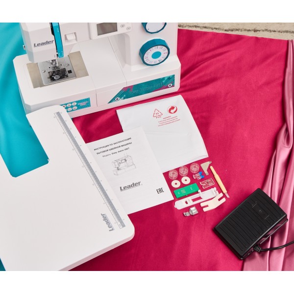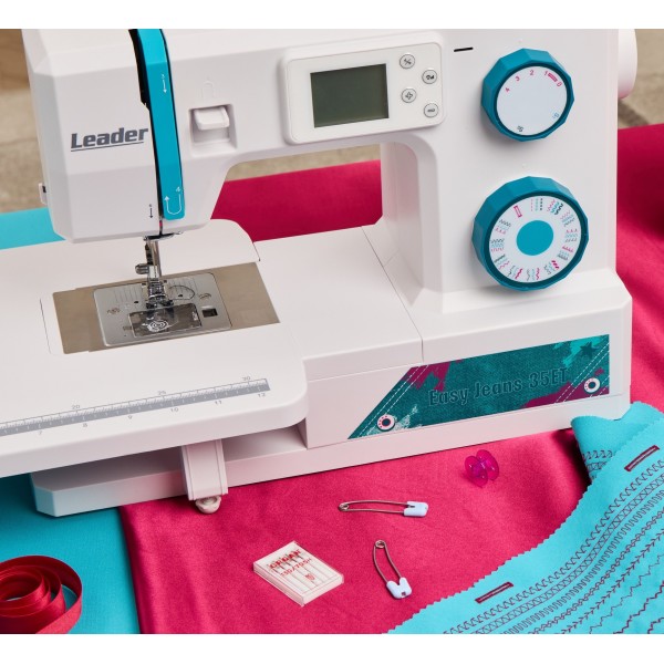 В машине есть встроенный нитевдеватель, который ускоряет процесс заправки нити в ушко иглы, и функция работы с двойной иглой. Однако двойная игла должна быть приобретена отдельно.Leader Easy Jeans 35ET также имеет съёмный столик, что облегчает доступ к свободному рукаву для шитья мелких изделий по кругу, например, рукавов и брючин.