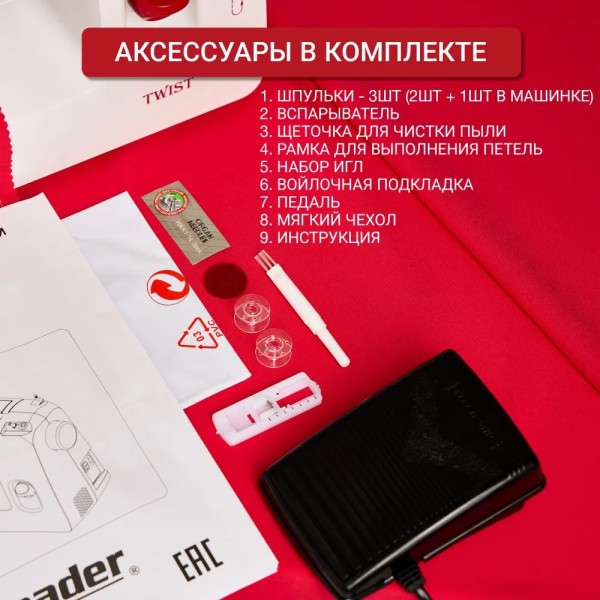 Иглы, шпульки, распарыватель, щеточка для очистки, фетровая прокладка, инструкция на русском языке, чехол (мягкий), педаль