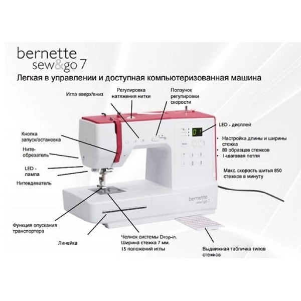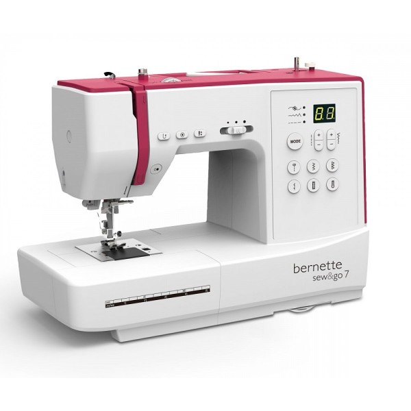 Электронная швейная машина Bernette Sew&go 7 из новой серии от Bernina станет отличным выбором для тех, кто предъявляет высокие запросы в шитье одежды или предметов домашнего интерьера. В меньшей степени она подойдет для любителей декорирования, т.к. отсутствует функция памяти и алфавит, но и для них припасено целых 49 декоративных строчек.