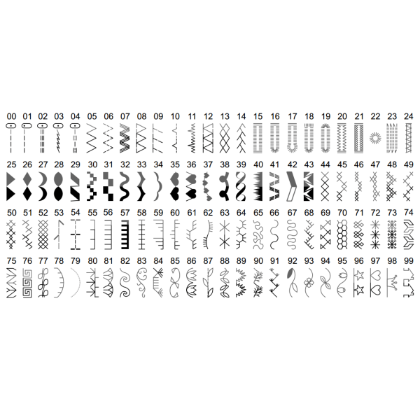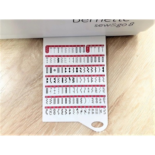 Количество операций швейной машины Bernina Bernette Sew&Go 8 — 100 шт. Петель автомат - 7 шт + глазок. Буквы (алфавит) и цифры + 97 шт.