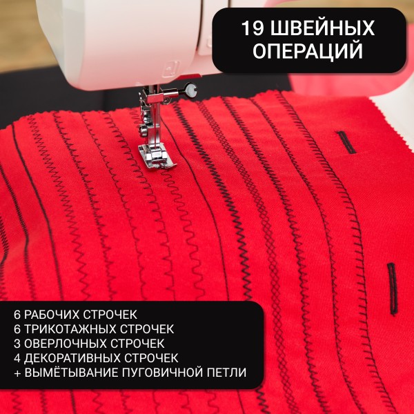 Классический вертикальный челнок обеспечивает плавную работу и простоту обслуживания, а 18 различных строчек, включая строчки, имитирующие оверлок, потайнаые строчки, трикотажные и эластичные, позволят вам создавать изделия любой сложности.