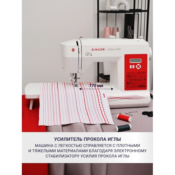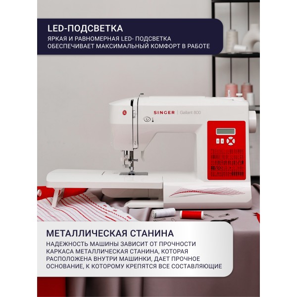 Singer Gallant 800 является машиной, на которую необходимо обратить внимание тем, кто предпочитает электронные настройки и желает найти лучший вариант за оптимальную цену. Модель оснащена надёжным вертикальным челноком. Программа для пришивания пуговиц облегчит вам процесс шитья.