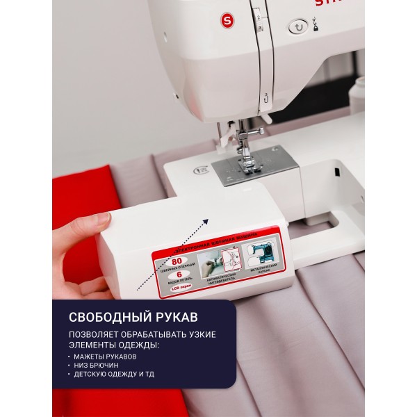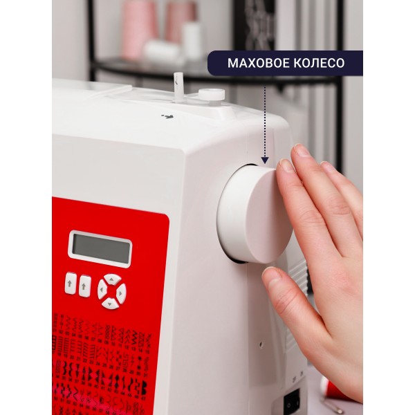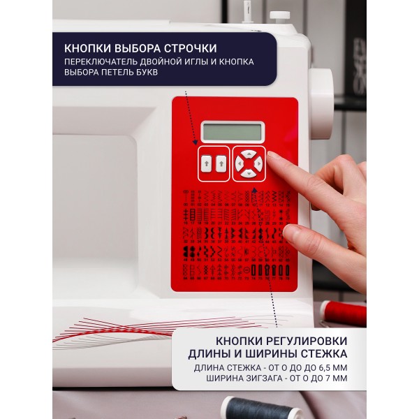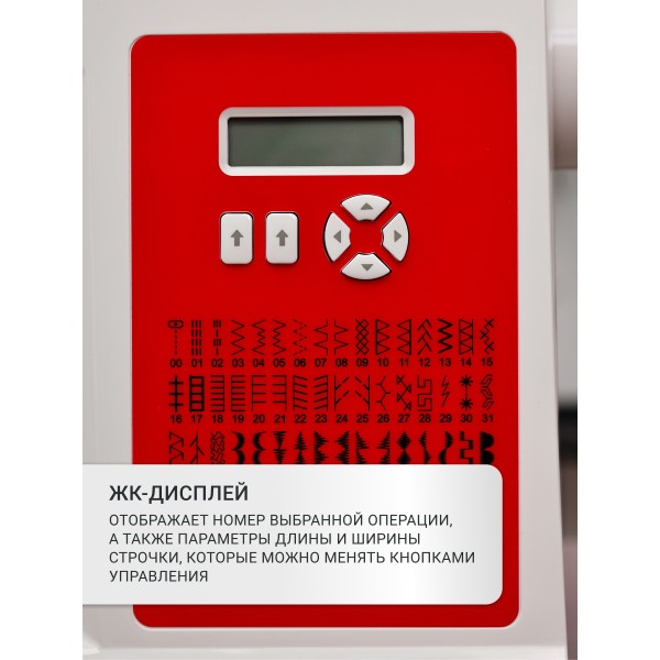 Настройки абсолютно всех операций видны на монохромном дисплее. За комфортное шитье отвечает нитевдеватель, яркое освещение вокруг лапки и удобная рукавная платформа для шитья узких деталей.