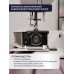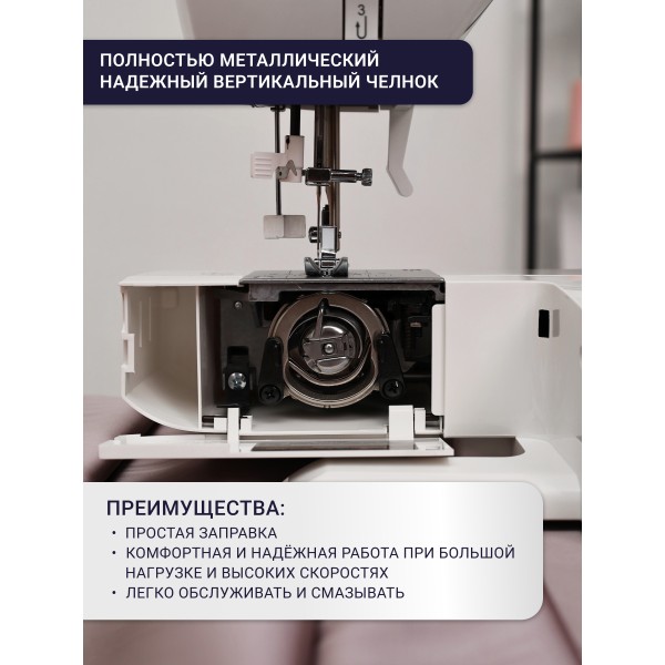 Эта модель отличается от других машин бренда, тем что есть приставной столик, на котором довольно удобно шить большие изделия. Если нужно будет отключить нижний транспортёр, установите штопальную пластину. Также есть переключатель направления шитья (реверс) и возможность использования двойной иглы.